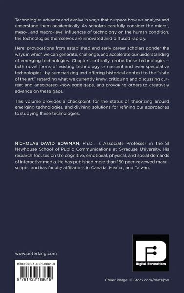 Here, provocations from established and early career scholars ponder the ways in which we can generate, challenge, and accelerate our understanding of emerging technologies. Chapters critically probe these technologies-both novel forms of existing technology or nascent and even speculative technologies-by summarizing and offering historical context to the "state of the art" regarding what we currently know, critiquing and discussing current and anticipated knowledge gaps, and provoking others to creatively advance on these gaps.