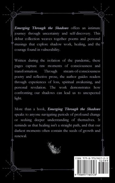 A powerful voice emerges to illuminate the transformative journey of embracing our inner darkness. Emerging Through the Shadows: The Journey of a Writer is a soul-stirring collection of poetry and musings that chronicles one writer's quest to find her authentic voice amidst the chaos of self-doubt and creative awakening. Raw, honest, and unflinching, this debut work masterfully weaves stream-of-consciousness poetry with intimate prose, creating a tapestry of human experience that speaks directly to your soul. Through shadow work-the brave exploration of our hidden selves-the author reveals universal truths about the writer's journey, creative metamorphosis, and the fierce courage required to face our deepest vulnerabilities. Each page captures the struggle and triumph of finding one's voice in a world that often demands our silence. Emerging Through the Shadows proves that our darkest moments contain the seeds of our most profound transformation. Whether you're a writer finding your way or a soul seeking authenticity, this collection will ignite your creative spirit and illuminate your path toward self-discovery and renewal. Don't wait to begin your own journey of emergence-your voice matters, and your story deserves to be told.