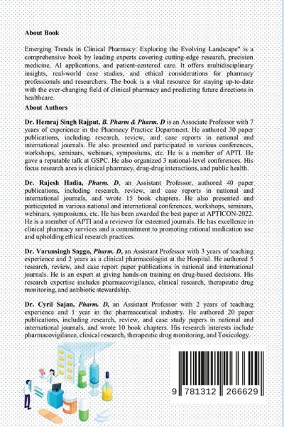 Emerging Trends in Clinical Pharmacy: Exploring the Evolving Landscape" is a comprehensive book by leading experts, covering cutting-edge research, precision medicine, AI applications, and patient-centered care. It offers multidisciplinary insights, real-world case studies, and ethical considerations for pharmacy professionals and researchers. The book is a vital resource for staying up-to-date with the ever-changing field of clinical pharmacy and predicting future directions in healthcare.
