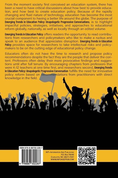 From the moment society first conceived an education system, there has been a need to have critical discussions about how best to provide education, and how best to create education policy. Because of the rapidly changing and fluid nature of technology, education has become the most crucial component to having a better life around the globe. The purpose of Emerging Trends in Education Policy: Unapologetic Progressive Conversations, is to highlight impactful policies, strategies, initiatives, and approaches to educational reform globally, nationally, as well as locally through an edited volume. Emerging Trends in Education Policy offers readers the opportunity to read contributions from researchers and policymakers who like to make a ruckus and speak to an audience that appreciates disruption. Emerging Trends in Education Policy provides space for researchers to take intellectual risks and policymakers to be on the cutting edge of educational policy change. Educators often do not have the time to research and propose policy recommendations despite the fact they are the people that deliver the content. Professors often delay their more provocative findings and suggestions until after full tenure. By encouraging chapters from professors that were K-12 teachers at one time first, and researchers second, Emerging Trends in Education Policy: Unapologetic Progressive Conversation fulfills the need for innovative policy reform based on recommendations from practitioners with direct knowledge in the field.