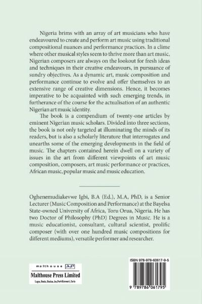Nigeria brims with an array of art musicians who have endeavoured to create and perform art music using traditional compositional nuances and performance practices. In a clime where other musical styles seem to thrive more than art music, Nigerian composers are always on the lookout for fresh ideas and techniques in their creative endeavours, in pursuance of sundry objectives. As a dynamic art, music composition and performance continue to evolve and offer themselves to an extensive range of creative dimensions. Hence, it becomes imperative to be acquainted with such emerging trends, in furtherance of the course for the actualisation of an authentic Nigerian art music identity. The book is a compendium of twenty-one articles by eminent Nigerian music scholars. Divided into three sections, the book is not only targeted at illuminating the minds of its readers, but is also a scholarly literature that interrogates and unearths some of the emerging developments in the field of music. The chapters contained herein dwell on a variety of issues in the art from different viewpoints of art music composition, composers, art music performance or practices, African music, popular music and music education.