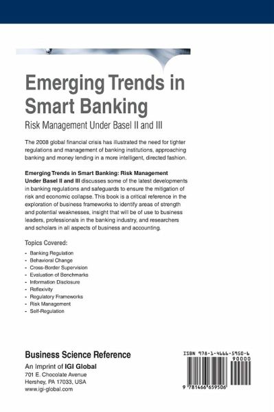 The 2008 global financial crisis has illustrated the need for tighter regulations and management of banking institutions, approaching banking and money lending in a more intelligent, directed fashion. Emerging Trends in Smart Banking: Risk Management Under Basel II and III discusses some of the latest developments in banking regulations and safeguards to ensure the mitigation of risk and economic collapse. This book is a critical reference in the exploration of business frameworks to identify areas of strength and potential weaknesses, insight that will be of use to business leaders, professionals in the banking industry, and researchers and scholars in all aspects of business and accounting.