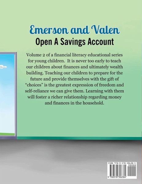 The second book in the Emerson and Valen Financial Literacy Series. In the first book Emerson and Valen learn the value of money, what things cost and doing chores to earn money, In this volume Emerson and Valen learn the value of saving for long term goals. Teaching our children how important it is to manage their money responsibly by saving for the future early is one of the most important things we can do to ensure their futures. Emerson and Valen Open a Savings Account teaches children about saving, compound interest, and patience inn reaching their goals.