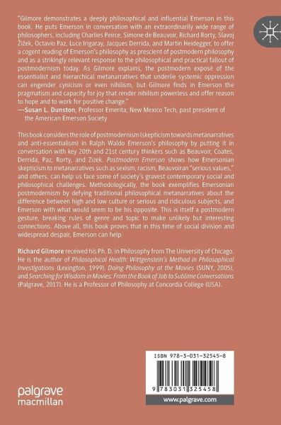 This book considers the role of postmodernism (skepticism towards metanarratives and anti-essentialism) in Ralph Waldo Emerson's philosophy by putting it in conversation with key 20th and 21st century thinkers such as Beauvoir, Coates, Derrida, Paz, Rorty, and Zizek. Postmodern Emerson shows how Emersonian skepticism to metanarratives such as sexism, racism, Beauvoiran "serious values," and others, can help us face some of society's gravest contemporary social and philosophical challenges. Methodologically, the book exemplifies Emersonian postmodernism by defying traditional philosophical metanarratives about the difference between high and low culture or serious and ridiculous subjects, and Emerson with what would seem to be his opposite. This is itself a postmodern gesture, breaking rules of genre and topic to make unlikely but interesting connections. Above all, this book proves that in this time of social division and widespread despair, Emerson canhelp.