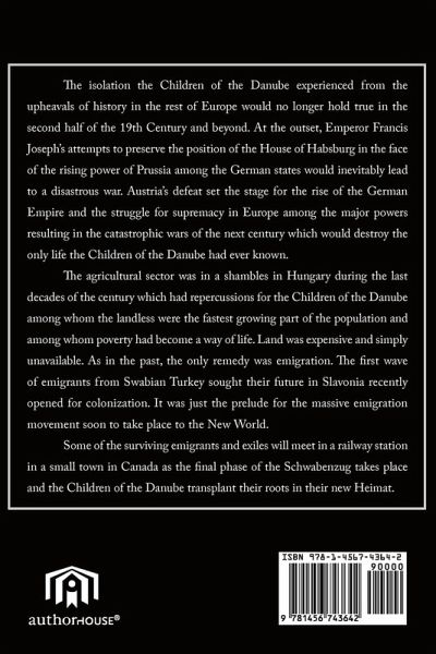 The isolation the Children of the Danube experienced from the upheavals of history in the rest of Europe would no longer hold true in the second half of the 19th Century and beyond. At the outset, Emperor Francis Joseph's attempts to preserve the position of the House of Habsburg in the face of the rising power of Prussia among the German states would inevitably lead to a disastrous war. Austria's defeat set the stage for the rise of the German Empire and the struggle for supremacy in Europe among the major powers resulting in the catastrophic wars of the next century which would destroy the only life the Children of the Danube had ever known. The agricultural sector was in a shambles in Hungary during the last decades of the century which had repercussions for the Children of the Danube among whom the landless were the fastest growing part of the population and among whom poverty had become a way of life. Land was expensive and simply unavailable. As in the past, the only remedy was emigration. The first wave of emigrants from Swabian Turkey sought their future in Slavonia recently opened for colonization. It was just the prelude for the massive emigration movement soon to take place to the New World. Some of the surviving emigrants and exiles will meet in a railway station in a small town in Canada as the final phase of the Schwabenzug takes place and the Children of the Danube transplant their roots in their new Heimat.