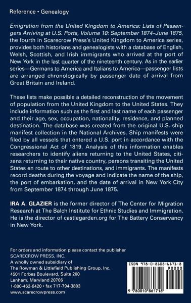 This series on Emigration from the United Kingdom to America concentrates on U.K. emigration in the period 1870-1897, listing migrants from the U.K. who arrived in New York. The original passenger lists transcribed by shipping agents and ship's officers and filed by all vessels entering U.S ports have been used in the preparation of Emigration from the United Kingdom to America. Presented in chronological order by each ship's date of arrival, these passenger lists provide the names of ships, ports of departure, and arrival and debarkation dates. The researcher can also locate data regarding a person's age, sex, and occupation, as well as village of origin and destination when reported.