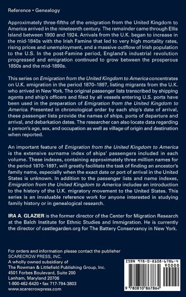 This series on Emigration from the United Kingdom to America concentrates on U.K. emigration in the period 1870-1897, listing migrants from the U.K. who arrived in New York. The original passenger lists transcribed by shipping agents and ship's officers and filed by all vessels entering U.S ports have been used in the preparation of Emigration from the United Kingdom to America. Presented in chronological order by each ship's date of arrival, these passenger lists provide the names of ships, ports of departure, and arrival and debarkation dates. The researcher can also locate data regarding a person's age, sex, and occupation, as well as village of origin and destination when reported.