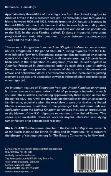 This series on Emigration from the United Kingdom to America concentrates on U.K. emigration in the period 1870-1897, listing migrants from the U.K. who arrived in New York. The original passenger lists transcribed by shipping agents and ship's officers and filed by all vessels entering U.S ports have been used in the preparation of Emigration from the United Kingdom to America. Presented in chronological order by each ship's date of arrival, these passenger lists provide the names of ships, ports of departure, and arrival and debarkation dates. The researcher can also locate data regarding a person's age, sex, and occupation, as well as village of origin and destination when reported.