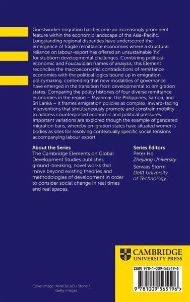 Guestworker migration has become an increasingly prominent feature within the economic landscape of the Asia-Pacific. Longstanding regional disparities have underscored the emergence of fragile remittance economies where a structural reliance on labour-export has offered an unsustainable 'fix' for stubborn developmental challenges. Combining political-economic and Foucauldian frames of analysis, this Element reconciles the macroeconomic contradictions of remittance economies with the political logics bound up in emigration policymaking, contending that new modalities of governance have emerged in the transition from developmental to emigration states. Comparing the policy histories of four diverse remittance economies in the region - Myanmar, the Philippines, Samoa, and Sri Lanka - it frames emigration policies as complex, inward-facing interventions that simultaneously promote and constrain mobility to address counterpoised economic and political pressures. Important variations are explored though the example of gendered migration bans, whereby emigration states have situated women's bodies as sites for resolving contextually specific social tensions accompanying labour-export.
