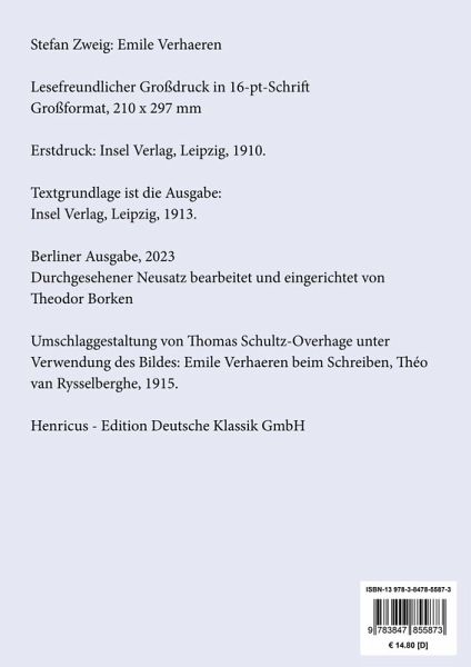 Stefan Zweig: Emile VerhaerenLesefreundlicher Großdruck in 16-pt-SchriftGroßformat, 210 x 297 mmBerliner Ausgabe, 2023Durchgesehener Neusatz bearbeitet und eingerichtet von Theodor BorkenErstdruck: Insel Verlag, Leipzig, 1910.Textgrundlage ist die Ausgabe:Insel Verlag, Leipzig, 1913.Umschlagabbildung: Emile Verhaeren beim Schreiben, Théo van Rysselberghe, 1915Gesetzt aus der Minion Pro, 16 pt.Henricus - Edition Deutsche Klassik GmbHÜber den Autor:1881 in eine großbürgerliche Unternehmerfamilie in Wien hineingeboren, beginnt Stefan Zweig noch bevor er sein Abitur ablegt mit der Veröffentlichung erster Gedichte. Eine rasante Schriftstellerkarriere steht ihm bevor. 1928 - Zweig ist 47 Jahre alt - erscheint die Biografie »Stefan Zweig, der Mann und das Werk«. Letzteres war bereits im Jahr zuvor in einer zehnbändigen Ausgabe mit einer Einleitung von Maxim Gorki in russischer Übersetzung erschienen. Er ist einer der meistübersetzten Schriftsteller seiner Zeit, seine Werke erreichen Auflagen von mehr als 100.000 Exemplaren und werden oft verfilmt. Zu seinem 50. Geburtstag bilanziert Stefan Zweig: »Eigentlich hätte man jetzt genug vom Leben. Was jetzt noch kommen kann, ist doch nichts als Abstieg.« Und er sollte auf tragische Weise recht behalten. 1933 sieht er in dem Ausbrechen des Nationalsozialismus bereits ein »Vorspiel zu viel weiterreichenden Eingriffen«. Ein Jahr darauf verlässt er seine Heimat. In Deutschland werden seine Bücher verboten und verbrannt. Zweig lebt zunächst in England im Exil, 1941 kommt er - nach einer Station im Staat New York - schließlich nach Brasilien, wo er am 22. Februar 1942 »aus freiem Willen und mit klaren Sinnen« aus dem Leben scheidet. In seinem Abschiedsbrief sieht er die Welt seiner eigenen Sprache untergegangen und seine geistige Heimat Europa vernichtet. Der letzte Gruß an seine Freunde schließt mit dem Wunsch: »Mögen sie die Morgenröte noch sehen nach der langen Nacht! Ich, allzu Ungeduldiger, gehe ihnen voraus.«