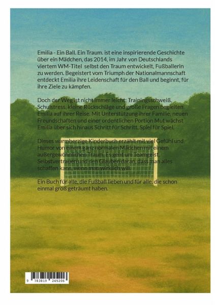Emilia - Ein Ball. Ein Traum. ist eine inspirierende Geschichte über ein Mädchen, das 2014, im Jahr von Deutschlands viertem WM-Titel selbst den Traum entwickelt, Fußballerin zu werden. Begeistert vom Triumph der Nationalmannschaft entdeckt Emilia ihre Leidenschaft für den Ball und beginnt, für ihre Ziele zu kämpfen. Doch der Weg ist nicht immer leicht: Trainingsschweiß, Schulstress, kleine Rückschläge und große Fragen begleiten Emilia auf ihrer Reise. Mit Unterstützung ihrer Familie, neuen Freundschaften und einer ordentlichen Portion Mut wächst Emilia über sich hinaus Schritt für Schritt, Spiel für Spiel. Dieses warmherzige Kinderbuch erzählt mit viel Gefühl und Humor von einem ganz normalen Mädchen mit einem außergewöhnlichen Traum. Es geht um Teamgeist, Selbstvertrauen und den Glauben daran, dass man alles schaffen kann, wenn man wirklich will. Ein Buch für alle, die Fußball lieben und für alle, die schon einmal groß geträumt haben.