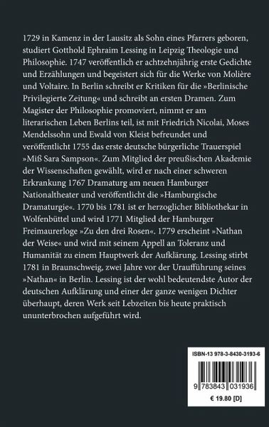 1729 in Kamenz in der Lausitz als Sohn eines Pfarrers geboren, studiert Gotthold Ephraim Lessing in Leipzig Theologie und Philosophie. 1747veröffentlich er achtzehnjährig erste Gedichte und Erzählungen und begeistert sich für die Werke von Molière und Voltaire. In Berlin schreibt er Kritiken für die "Berlinische Privilegierte Zeitung" und schreibt an ersten Dramen. Zum Magister der Philosophie promoviert, nimmt er am literarischen Leben Berlins teil, ist mit Friedrich Nicolai, Moses Mendelssohn und Ewald von Kleist befreundet und veröffentlicht 1755 das erste deutsche bürgerliche Trauerspiel "Miß Sara Sampson". Zum Mitglied der preußischen Akademie der Wissenschaften gewählt, wird er nach einer schweren Erkrankung 1767 Dramaturg am neuen Hamburger Nationaltheater und veröffentlicht die "Hamburgische Dramaturgie". 1770 bis 1781 ist er herzoglicher Bibliothekar in Wolfenbüttel und wird 1771 Mitglied der Hamburger Freimaurerloge "Zu den drei Rosen". 1779 erscheint "Nathan der Weise" und wird mit seinem Appell an Toleranz und Humanität zu einem Hauptwerk der Aufklärung. Lessing stirbt 1781 in Braunschweig, zwei Jahre vor der Uraufführung seines "Nathan" in Berlin. Lessing ist der wohl bedeutendste Autor der deutschen Aufklärung und einer der ganze wenigen Dichter überhaupt, deren Werk seit Lebzeiten bis heute praktisch ununterbrochen aufgeführt wird.