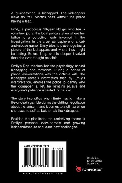 A businessman is kidnapped. The kidnappers leave no trail. Months pass without the police having a lead. Emily, a precocious 16-year old girl who has a volunteer job at the local police station where her father is a detective, gets involved in the investigation. In the cruel atmosphere of a cat-and-mouse game, Emily tries to piece together a picture of the kidnappers and where they might be hiding. Before long, she is deeper involved than she ever thought possible. Emily's Dad teaches her the psychology behind kidnapping and terrorism. During a series of phone conversations with the victim s wife, the kidnapper reveals information that, by Emily s interpretation, enables the police to identify who the kidnapper is. Yet, he remains elusive and everyone s patience is tested to the limit. The story intensifies when Emily has to make a life-or-death gamble during the chilling negotiation about the ransom, and it comes to a climax when she uses herself as bait to nab the kidnapper. Besides the plot itself, the underlying theme is Emily's personal development and growing independence as she faces new challenges.