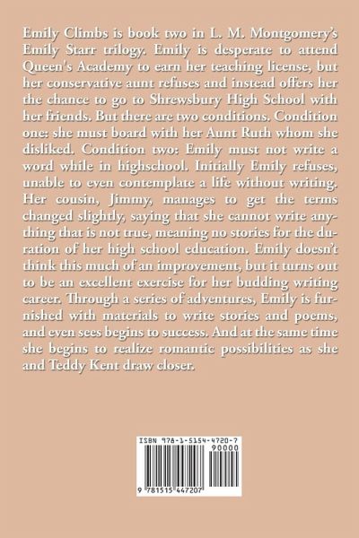 Emily Climbs is book two in L. M. Montgomery's Emily Starr trilogy. Emily is desperate to attend Queen's Academy to earn her teaching license, but her conservative aunt refuses and instead offers her the chance to go to Shrewsbury High School with her friends. But there are two conditions. Condition one: she must board with her Aunt Ruth whom she disliked. Condition two: Emily must not write a word while in highschool. Initially Emily refuses, unable to even contemplate a life without writing. Her cousin, Jimmy, manages to get the terms changed slightly, saying that she cannot write anything that is not true, meaning no stories for the duration of her high school education. Emily doesn't think this much of an improvement, but it turns out to be an excellent exercise for her budding writing career. Through a series of adventures, Emily is furnished with materials to write stories and poems, and even sees begins to success. And at the same time she begins to realize romantic possibilities as she and Teddy Kent draw closer.