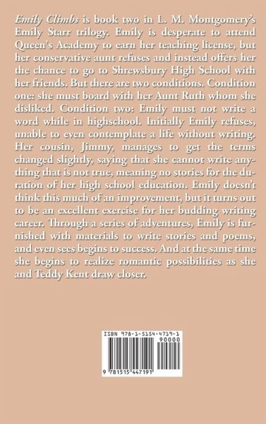 Emily Climbs is book two in L. M. Montgomery’s Emily Starr trilogy. Emily is desperate to attend Queen's Academy to earn her teaching license, but her conservative aunt refuses and instead offers her the chance to go to Shrewsbury High School with her friends. But there are two conditions. Condition one: she must board with her Aunt Ruth whom she disliked. Condition two: Emily must not write a word while in highschool. Initially Emily refuses, unable to even contemplate a life without writing. Her cousin, Jimmy, manages to get the terms changed slightly, saying that she cannot write anything that is not true, meaning no stories for the duration of her high school education. Emily doesn’t think this much of an improvement, but it turns out to be an excellent exercise for her budding writing career. Through a series of adventures, Emily is furnished with materials to write stories and poems, and even sees begins to success. And at the same time she begins to realize romantic possibilities as she and Teddy Kent draw closer.