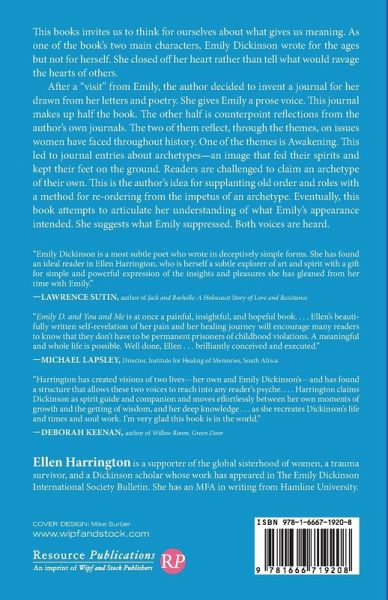 This books invites us to think for ourselves about what gives us meaning. As one of the book's two main characters, Emily Dickinson wrote for the ages but not for herself. She closed off her heart rather than tell what would ravage the hearts of others. After a ""visit"" from Emily, the author decided to invent a journal for her drawn from her letters and poetry. She gives Emily a prose voice. This journal makes up half the book. The other half is counterpoint reflections from the author's own journals. The two of them reflect, through the themes, on issues women have faced throughout history. One of the themes is Awakening. This led to journal entries about archetypes--an image that fed their spirits and kept their feet on the ground. Readers are challenged to claim an archetype of their own. This is the author's idea for supplanting old order and roles with a method for re-ordering from the impetus of an archetype. Eventually, this book attempts to articulate her understanding of what Emily's appearance intended. She suggests what Emily suppressed. Both voices are heard.
