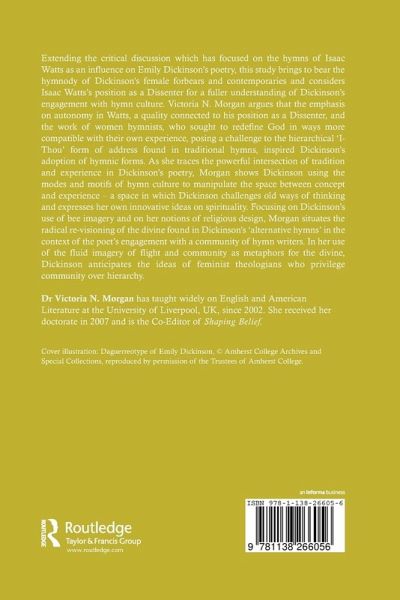Contents: Preface; Part 1 Hymn Culture: Tradition and Theory: 'Twas as space sat singing to herself - and men - ': situating Dickinson's relation to hymn culture; The hymn - a form of devotion?; Theorising hymnic space: language, subjectivity and re-visioning the divine. Part 2Tradition and Experience: Refiguring Dickinson's Experience of Hymn Culture: Making the sublime ridiculous: Emily Dickinson and Isaac Watts in dissent; 'The prospect oft my strength renews': spiritual transport in the hymns of Phoebe Hinsdale Brown and Eliza Lee Follen. Part 3 Experiments in Hymn Culture: Tracing Dickinson's bee imagery; 'Why floods be served to us in bowls -/I speculate no more': reading Dickinson's strategy; Index; Bibliography; Index.