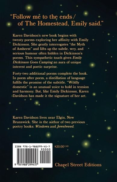 Karen Davidson's new book begins with twenty poems exploring her affinity with Emily Dickinson. She gently interrogates "the Myth of Amherst" and lifts up the subtle, wry, and serious humour often hidden in Dickinson's poems. This sympathetic touch gives Emily Dickinson Goes Camping an aura of unique interest and poetic surprise. Forty-two additional poems complete the book. In poem after poem, a distillation of language fulfils the promise of the subtitle. "Wildly domestic" is an unusual voice to hold in tension and harmony. But, like Emily Dickinson, Karen Davidson has made it the signature of her art.