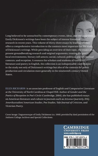 List of illustrations Notes on contributors Acknowledgments and note on the text List of abbreviations Chronology Introduction Eliza Richards Part I. Local Environments: 1. Amherst Domhnall Mitchell 2. Reading in the Dickinson libraries Eleanor Elson Heginbotham 3. Education Angela Sorby 4. New England Puritan heritage Jane Donahue Eberwein 5. Nature's influence Margaret H. Freeman Part II. Literary Contexts: Sources, Influences, Intertextual Engagements: 6. The Bible Emily Seelbinder 7. Shakespeare Páraic Finnerty 8. Renaissance and eighteenth-century literature David Cody 9. British Romantic and Victorian influences Elizabeth Petrino 10. Transatlantic women writers Páraic Finnerty 11. Immediate US literary predecessors Cristanne Miller 12. US literary contemporaries: Dickinson's moderns Mary Loeffelholz 13. Periodical reading Joan Kirkby Part III. Social, Cultural, Political, and Intellectual Contexts: 14. Religion James McIntosh 15. Death and immortality Joan Kirkby 16. Gendered poetics Shira Wolosky 17. Democratic politics Paul Crumbley 18. Economics Elizabeth Hewitt 19. Law and legal discourse James Guthrie 20. Slavery and the Civil War Faith Barrett 21. Popular culture Sandra Runzo 22. Visual arts: the Pentimento Alexander Nemerov 23. Natural sciences Sabine Sielke 24. Nineteenth-century language theory and the manuscript variants Melanie Hubbard 25. 'Say some philosopher!' Jed Deppman Part IV. Reception: 26. Editorial history I: beginnings to 1955 Martha Nell Smith 27. Editorial history II: 1955 to the present Alexandra Socarides 28. On materiality (and virtuality) Gabrielle Dean 29. The letters archive Cindy MacKenzie 30. Critical history I: 1890 to 1955 Theo Davis 31. Critical history II: 1955 to the present Magdalena Zapedowska 32. Dickinson's influence Thomas Gardner 33. Translation and international reception Domhnall Mitchell Further reading Index.