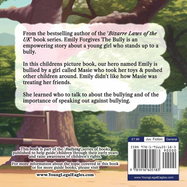 From the bestselling author of the 'Bizarre Laws of the UK' book series. Emily Forgives The Bully is an empowering story about a young girl who stands up to a bully. In this childrens picture book, our hero named Emily is bullied by a girl called Masie who took toys & pushed other children around. Emily didn't like how Masie was treating her friends. She learned who to talk to about the bullying and of the importance of speaking out against bullying. Teach your children how to deal with bullying, and who they can speak to for help. This book is part of the 'Bullying' series of books published to help guide children through their early years and raise awareness of children's rights. 'Emily Forgives The Bully' is intended for children of primary school age (ages 3-8yrs). We warmly recommend it to parents, teachers, and anyone who works with children.