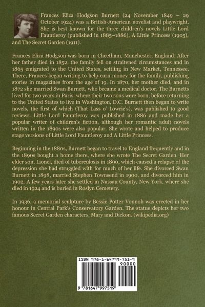 Frances Eliza Hodgson Burnett (24 November 1849 – 29 October 1924) was a British-American novelist and playwright. She is best known for the three children's novels Little Lord Fauntleroy (published in 1885–1886), A Little Princess (1905), and The Secret Garden (1911). Frances Eliza Hodgson was born in Cheetham, Manchester, England. After her father died in 1852, the family fell on straitened circumstances and in 1865 emigrated to the United States, settling in New Market, Tennessee. There, Frances began writing to help earn money for the family, publishing stories in magazines from the age of 19. In 1870, her mother died, and in 1872 she married Swan Burnett, who became a medical doctor. The Burnetts lived for two years in Paris, where their two sons were born, before returning to the United States to live in Washington, D.C. Burnett then began to write novels, the first of which (That Lass o' Lowrie's), was published to good reviews. Little Lord Fauntleroy was published in 1886 and made her a popular writer of children's fiction, although her romantic adult novels written in the 1890s were also popular. She wrote and helped to produce stage versions of Little Lord Fauntleroy and A Little Princess. Beginning in the 1880s, Burnett began to travel to England frequently and in the 1890s bought a home there, where she wrote The Secret Garden. Her elder son, Lionel, died of tuberculosis in 1890, which caused a relapse of the depression she had struggled with for much of her life. She divorced Swan Burnett in 1898, married Stephen Townsend in 1900, and divorced him in 1902. A few years later she settled in Nassau County, New York, where she died in 1924 and is buried in Roslyn Cemetery. In 1936, a memorial sculpture by Bessie Potter Vonnoh was erected in her honour in Central Park's Conservatory Garden. The statue depicts her two famous Secret Garden characters, Mary and Dickon. (wikipedia.org)