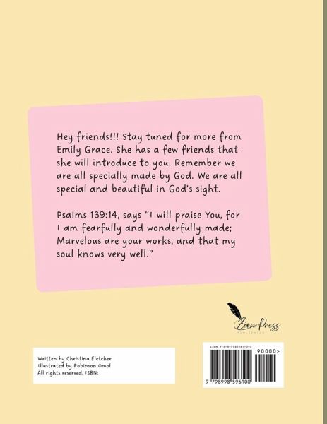 This book is about a little girl with Down syndrome named Emily Grace. It will introduce her and her teacher. This is the first book in a series of eight, each one designed to promote love and appreciation for all children, no matter their ability. God created us all special. We are fearfully and wonderfully made.