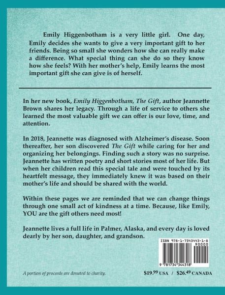 In her new book, Emily Higgenbotham, The Gift, author Jeannette Brown shares her legacy of a life of service to others where she learned the most valuable gift we can offer is our love, time, and attention. Emily Higgenbotham is a very little girl with lots of friends. Emily spends time with one of her friends daily. One day, she decides she wants to give a very important gift to her friends. But being so small she wonders how she can really make a difference or give them the right gift. What special thing can she do so they know how she feels? With her mother's help, Emily learns the most important gift she can give is of herself. Emily learns SHE is the gift her friends needed most.
