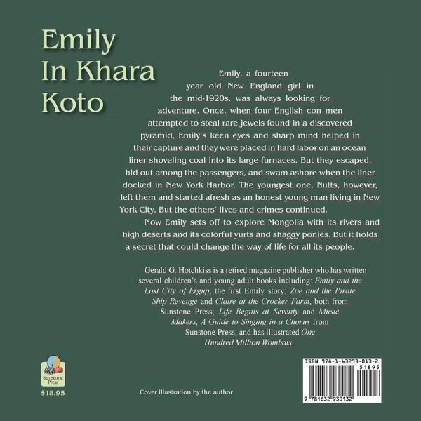 Emily, a fourteen year old New England girl in the mid-1920s, is always looking for adventure. Once, when four English con men attempted to steal rare jewels found in a discovered pyramid, Emily's keen eyes and sharp mind helped in their capture and they were placed in hard labor on an ocean liner shoveling coal into its large furnaces. But they escaped, hid out among the passengers, and swam ashore when the liner docked in New York Harbor. The youngest one, Nutts, however, left them and started afresh as an honest young man living in New York City. But the others' lives and crimes continued. Now Emily sets off to explore Mongolia with its rivers and high deserts and its colorful yurts and shaggy ponies. But it holds a secret that could change the way of life for all its people. Gerald G. Hotchkiss is a retired magazine publisher who has written several children's and young adult books including: "Emily and the Lost City of Ergup," the first Emily story; "Zoe and the Pirate Ship Revenge" and "Claire at the Crocker Farm," both from Sunstone Press; "Life Begins at Seventy" and "Music Makers, A Guide to Singing in a Chorus" from Sunstone Press; and has illustrated "One Hundred Million Wombats."