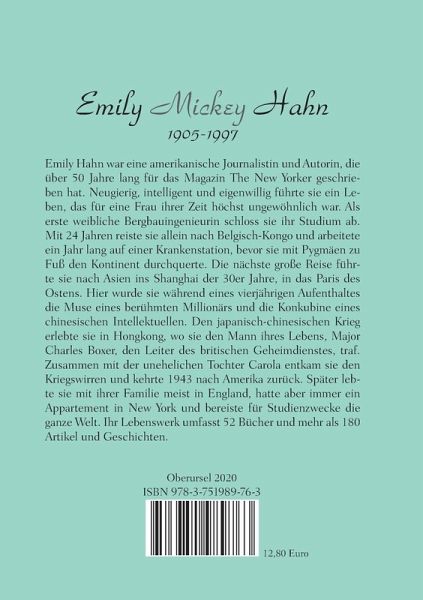 Emily Hahn war eine amerikanische Journalistin und Autorin, die über 50 Jahre lang für das Magazin The New Yorker geschrieben hat. Neugierig, intelligent und eigenwillig führte sie ein Leben, das für eine Frau ihrer Zeit höchst ungewöhnlich war. Als erste weibliche Bergbauingenieurin schloss sie ihr Studium ab. Mit 24 Jahren reiste sie allein nach Belgisch-Kongo und arbeitete ein Jahr lang auf einer Krankenstation, bevor sie mit Pygmäen zu Fuß den Kontinent durchquerte. Die nächste große Reise führte sie nach Asien ins Shanghai der 30er Jahre, in das Paris des Ostens. Hier wurde sie während eines vierjährigen Aufenthaltes die Muse eines berühmten Millionärs und die Konkubine eines chinesischen Intellektuellen. Den japanisch-chinesischen Krieg erlebte sie in Hongkong, wo sie den Mann ihres Lebens, Major Charles Boxer, den Leiter des britischen Geheimdienstes, traf. Zusammen mit der unehelichen Tochter Carola entkam sie den Kriegswirren und kehrte 1943 nach Amerika zurück. Später lebte sie mit ihrer Familie meist in England, hatte aber immer ein Appartement in New York und bereiste für Studienzwecke die ganze Welt. Ihr Lebenswerk umfasst 52 Bücher und mehr als 180 Artikel und Geschichten.