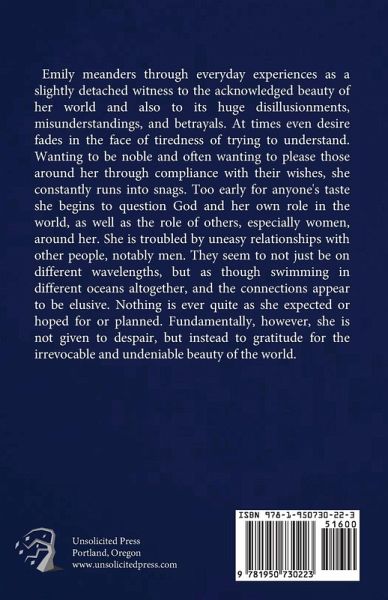 Emily meanders through everyday experiences as a slightly detached witness to the acknowledged beauty of her world and also to its huge disillusionments, misunderstandings, and betrayals. At times even desire fades in the face of tiredness of trying to understand. Wanting to be noble and often wanting to please those around her through compliance with their wishes, she constantly runs into snags. Too early for anyone's taste she begins to question God and her own role in the world, as well as the role of others, especially women, around her. She is troubled by uneasy relationships with other people, notably men. They seem to not just be on different wavelengths, but as though swimming in different oceans altogether, and the connections appear to be elusive. Nothing is ever quite as she expected or hoped for or planned. Fundamentally, however, she is not given to despair, but instead to gratitude for the irrevocable and undeniable beauty of the world.