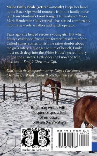 When Christmas is not all it seems, maybe the best gift of all isn't under the tree. Major Emily Beale (retired-mostly) keeps her hand in the Black Ops world remotely from the family horse ranch on Montana's Front Range. Her husband, Major Mark Henderson (fully retired), has settled comfortably into his new role as father and ranch operator. Years ago, she helped rescue a young girl. But when Emily's childhood friend, the former President of the United States, comes to visit, he raises doubts about the girl's safety. No longer so sure of herself, Emily must reach deep into the White House's secret library to find the answers. Little does she know the true location of Emily's Christmas Gift.