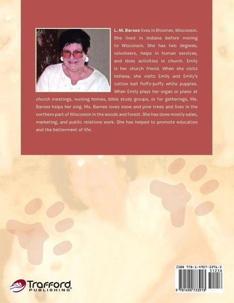 Emily and I are friends. When I go to visit her in Indiana, we go to church and bible studies together. Emily plays the organ or piano for churches, bible study groups, nursing homes, parties, and home gatherings. I get to go with her and help her sing. It is always fun to visit with her and her cotton ball fluffy-puffy white puppies. We go for walks in the apple orchard. They like to go for rides in the truck, sing, bark, play with toys, dig in the dirt, run after other animals, and bark-bark-bark. They are very lovable, fluffy, and soft.