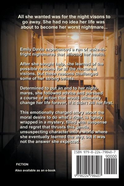Emily Davis experienced a run of wake-in-fright nightmares that affected her health. After she sought help, she learned of the possible reasons for all the nocturnal visions, but these reasons challenged some of her strong beliefs. Determined to put an end to her nightmares, she followed advice and pursued a course of action that would ultimately change her life forever, if it didn't kill her first. This emotionally charged story about the moral desire to do what's right, is tightly wrapped in a mystery, filled with suspense and regret that thrusts this gentle, unsuspecting character into a world where she eventually learned the why, but it was not the answer she expected.
