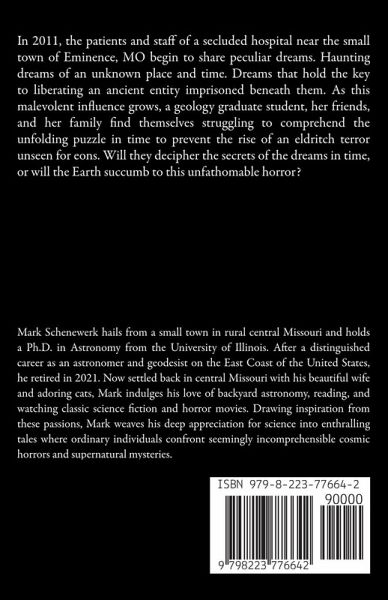 In 2011, the patients and staff of a secluded hospital near the small town of Eminence, MO begin to share peculiar dreams. Haunting dreams of an unknown place and time. Dreams that hold the key to liberating an ancient entity imprisoned beneath them. As this malevolent influence grows, a geology graduate student, her friends, and her family find themselves struggling to comprehend the unfolding puzzle in time to prevent the rise of an eldritch terror unseen for eons. Will they decipher the secrets of the dreams in time, or will the Earth succumb to this unfathomable horror?