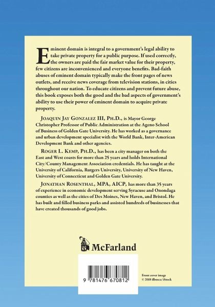 Eminent domain is integral to a government's legal ability to take private property for a public purpose. If used correctly, the owners are paid the fair market value for their property, few citizens are inconvenienced and everyone benefits. Bad-faith abuses of eminent domain typically make the front pages of news outlets, and receive news coverage from television stations, in cities throughout our nation. To educate citizens and prevent future abuse, this book exposes both the good and the bad aspects of government's ability to use their power of eminent domain to acquire private property.