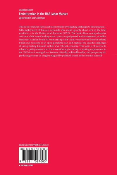 This book combines classic and recent studies investigating challenges to Emiratization - full employment of Emirati nationals who make up only about 10% of the total workforce - in the United Arab Emirates (UAE). The book offers a comprehensive overview of the events leading to the country's rapid growth and development, as well as important social and cultural issues arising as the country transitioned from an isolated traditional economy to an open globalized one, and explores the specific challenges of incorporating Emiratis in their own vibrant economy. This topic is of interest to scholars, policymakers, and those considering investing or seeking employment in the UAE since it emerged as a Western-friendly, politically stable, and prospering oil-producing country in a region plagued by political, social, and economic turmoil.