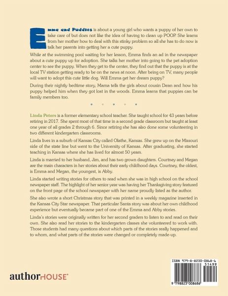 Emma and Puddles is about a young girl who wants a puppy of her own to take care of but does not like the idea of having to clean up POOP. She learns from her mother how to deal with this stinky problem so all she has to do now is talk her parents into getting her a cute puppy. While at the swimming pool waiting for her lesson, Emma finds an ad in the newspaper about a cute puppy up for adoption. She talks her mother into going to the pet adoption center to see the puppy. When they get to the center, they find out that the puppy is at the local TV station getting ready to be on the news at noon. After being on TV, many people will want to adopt this cute little dog. Will Emma get her dream puppy? During their nightly bedtime story, Mama tells the girls about cousin Dean and how his puppy helped him when they got lost in the woods. Emma learns that puppies can be family members too.