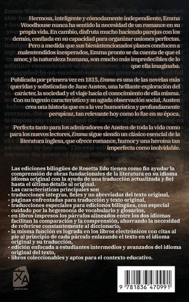 Hermosa, inteligente y cómodamente independiente, Emma Woodhouse nunca ha sentido la necesidad de un romance en su propia vida. En cambio, disfruta mucho haciendo parejas con los demás, confiada en su capacidad para organizar uniones perfectas. Pero a medida que sus bienintencionados planes conducen a malentendidos inesperados, Emma pronto se da cuenta de que el amor, y la naturaleza humana, son mucho más impredecibles de lo que ella imaginaba. Publicada por primera vez en 1815, Emma es una de las novelas más queridas y sofisticadas de Jane Austen, una brillante exploración del carácter, la sociedad y el viaje hacia el conocimiento de ella misma. Con su ingenio característico y su aguda observación social, Austen crea una historia que es a la vez humorística y profundamente perspicaz, tan relevante hoy como lo fue en su época. Perfecta tanto para los admiradores de Austen de toda la vida como para los nuevos lectores, Emma sigue siendo un clásico esencial de la literatura inglesa, que ofrece romance, humor y una heroína tan imperfecta como inolvidable.
