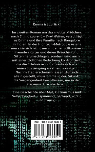 Emma ist zurück!Im zweiten Roman um das mutige Mädchen, nach Emma Laurent - Zwei Welten, verschlägt es Emma und ihre Familie nach Bangalore in Indien. In der Hightech-Metropole Asiens muss sie sich nicht nur mit einer vollkommen fremden Kultur und deren Bräuchen und Sitten herumschlagen, sondern wird auch mit einer tödlichen Bedrohung konfrontiert, die die Erlebnisse in Südfrankreich wie einen Spaziergang an einem sonnigen Nachmittag erscheinen lassen. Auf sich allein gestellt, muss Emma in der Zukunft die Vergangenheit beeinflussen, um in der Gegenwart zu überleben. Eine Geschichte über Mut, Optimismus und Selbstlosigkeit - spannend, packend, witzig und traurig.