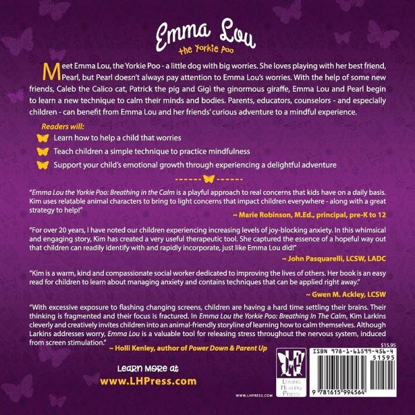 Meet Emma Lou, the Yorkie Poo - a little dog with big worries. She loves playing with her best friend, Pearl, but Pearl doesn't always pay attention to Emma Lou's worries. With the help of some new friends, Caleb the Calico cat, Patrick the pig and Gigi the ginormous giraffe, Emma Lou and Pearl begin to learn a new technique to calm their minds and bodies. Parents, educators, counselors - and especially children - can benefit from Emma Lou and her friends' curious adventure to a mindful experience. Readers will: Learn how to help a child that worries Teach children a simple technique to practice mindfulness Support your child's emotional growth through experiencing a delightful adventure "Emma Lou the Yorkie Poo: Breathing in the Calm is a playful approach to real concerns that kids have on a daily basis. Kim uses relatable animal characters to bring to light concerns that impact children everywhere - along with a great strategy to help!" -- Marie Robinson, M.Ed., principal, pre-K to 12 "For over 20 years, I have noted our children experiencing increasing levels of joy-blocking anxiety. In this whimsical and engaging story, Kim has created a very useful therapeutic tool. She captured the essence of a hopeful way out that children can readily identify with and rapidly incorporate, just like Emma Lou did!" -- John Pasquarelli, LCSW, LADC "Kim is a warm, kind and compassionate social worker dedicated to improving the lives of others. Her book is an easy read for children to learn about managing anxiety and contains techniques that can be applied right away." -- Gwen M. Ackley, LCSW "With excessive exposure to flashing changing screens, children are having a hard time settling their brains. Their thinking is fragmented and their focus is fractured. In Emma Lou the Yorkie Poo: Breathing In The Calm, Kim Larkins cleverly and creatively invites children into an animal-friendly storyline of learning how to calm themselves. Although Larkins addresses worry, Emma Lou is a valuable tool for releasing stress throughout the nervous system, induced from screen stimulation." -- Holli Kenley, author of Power Down & Parent Up From Loving Healing Press www.LHPress.com
