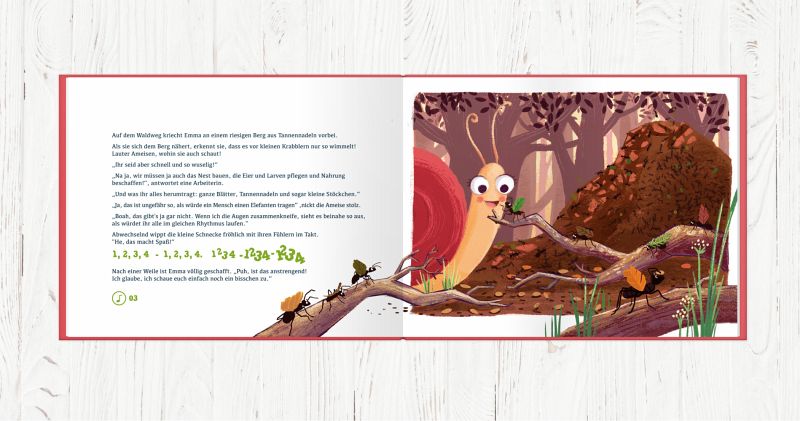 Emma freut sich darauf, an diesem schönen Tag die Welt zu entdecken und so macht sie sich fröhlich und gut gelaunt auf den Weg. Sie trifft Ameisen, die super fleißig sind und furchtbar stark. Sie