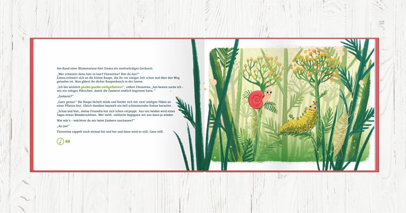 Emma freut sich darauf, an diesem schönen Tag die Welt zu entdecken und so macht sie sich fröhlich und gut gelaunt auf den Weg. Sie trifft Ameisen, die super fleißig sind und furchtbar stark. Sie trifft die Raupe, die offensichtlich zaubern kann. Den Specht mit seinem Klopfen, an dem jeder ihn erkennt. Eine Grille, die so schön musizieren und so hoch springen kann. Eine Spinne, die ihr wunderschönes, kunstvolles Netz spinnt. Libellen, die durch die Luft tanzen und so schön schillern. Frösche, die ein schönes Konzert geben. Nach all den tollen Tieren ist Emma plötzlich traurig, weil sie meint, selbst gar nichts zu können. Als Maulwurf die weinende Emma fragt, was denn los ist, erzählt sie ihm, was sie heute erlebt hat. Es kommen immer mehr Tiere dazu, die Emma gebannt zuhören. Und die ihr sagen, was für eine tolle Beobachterin und Geschichtenerzählerin sie ist. Emma ist überglücklich! Denn sie weiß, dass auch sie etwas ganz Besonderes ist und auf sich stolz sein kann.