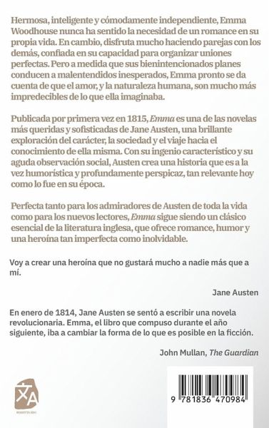 Hermosa, inteligente y cómodamente independiente, Emma Woodhouse nunca ha sentido la necesidad de un romance en su propia vida. En cambio, disfruta mucho haciendo parejas con los demás, confiada en su capacidad para organizar uniones perfectas. Pero a medida que sus bienintencionados planes conducen a malentendidos inesperados, Emma pronto se da cuenta de que el amor, y la naturaleza humana, son mucho más impredecibles de lo que ella imaginaba. Publicada por primera vez en 1815, Emma es una de las novelas más queridas y sofisticadas de Jane Austen, una brillante exploración del carácter, la sociedad y el viaje hacia el conocimiento de ella misma. Con su ingenio característico y su aguda observación social, Austen crea una historia que es a la vez humorística y profundamente perspicaz, tan relevante hoy como lo fue en su época. Perfecta tanto para los admiradores de Austen de toda la vida como para los nuevos lectores, Emma sigue siendo un clásico esencial de la literatura inglesa, que ofrece romance, humor y una heroína tan imperfecta como inolvidable.