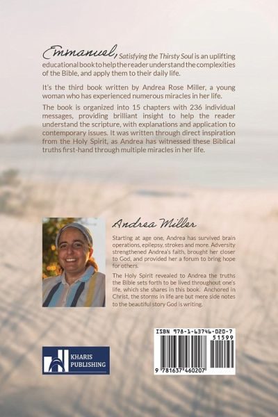Emmanuel: Satisfying the Thirsty Soul is an uplifting educational book to help the reader understand the complexities of the Bible, and apply them to their daily life. It's the third book written by Andrea Rose Miller, a young woman who has experienced numerous miracles in her life. The book is organized into 15 chapters with 236 individual messages, providing brilliant insight to help the reader understand the scripture, with explanations and application to contemporary issues. It was written through direct inspiration from the Holy Spirit, as Andrea has witnessed these Biblical truths first-hand through multiple miracles in her life. Endorsement: Andrea Miller is an amazing young woman. She reads Scripture with child-like faith but then goes deeper, asks questions, studies, seeking deeper meaning. Her insights are often astounding. She has an earnestness to learn all she can about God, then lives that out with refreshing openness and vulnerability. She does not pretend to have all the answers; she seeks all the answers. Andrea's writings are a gift to anyone who also seeks insight and deeper meaning. She is honest and authentic; truly a gifted child of God with a higher purpose. This book is an invitation to take a walk with the Lord. You will seek me and find me when you seek me with all your heart. -Jeri 29:13. -Rev. Larry Marshall, Pastor, Captiva Chapel by the Sea. About the Author: ÿþStarting at age one, Andrea has survived brain operations, epilepsy, strokes, and more. Adversity strengthened Andrea's faith, brought her closer to God, and provided her a forum to bring hope for others. The Holy Spirit revealed to Andrea the truths the Bible sets forth to be lived throughout one's life, which she shares in this book. Anchored in Christ, the storms in life are but mere side notes to the beautiful story God is writing.