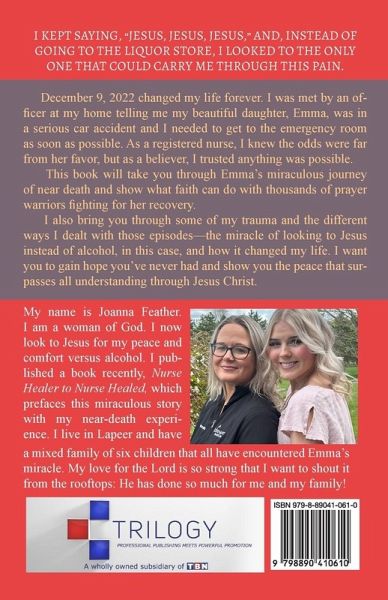 I KEPT SAYING, "JESUS, JESUS, JESUS," AND, INSTEAD OF GOING TO THE LIQUOR STORE, I LOOKED TO THE ONLY ONE THAT COULD CARRY ME THROUGH THIS PAIN. EMMA'S MIRACLE JOANNA FEATHER December 9, 2022 changed my life forever. I was met by an officer at my home telling me my beautiful daughter, Emma, was in a serious car accident and I needed to get to the emergency room as soon as possible. As a registered nurse, I knew the odds were far from her favor, but as a believer, I trusted anything was possible. This book will take you through Emma's miraculous journey of near death and show what faith can do with thousands of prayer warriors fighting for her recovery. I also bring you through some of my trauma and the different ways I dealt with those episodes-the miracle of looking to Jesus instead of alcohol, in this case, and how it changed my life. I want you to gain hope you've never had and show you the peace that surpasses all understanding through Jesus Christ.