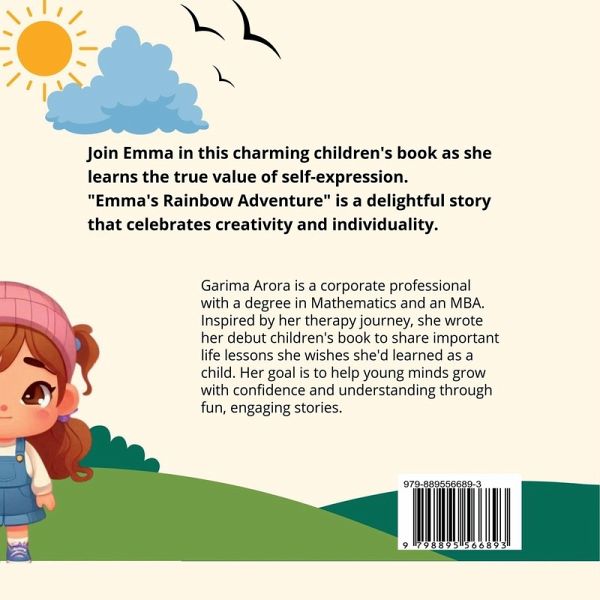 Join Emma in this charming children's book as she learns the true value of self-expression. With her magical box of crayons, Emma sets out to draw a rainbow, but when her friend Max points out the colors are out of order, Emma feels unsure. Guided by her best friend Daisy, Emma discovers that her unique creation is special just as it is. "Emma's Rainbow Adventure" is a delightful story that celebrates creativity and individuality, perfect for young readers ages 3-8. Key Features: -Vibrant illustrations -A heartwarming lesson on self-acceptance Celebrate creativity with Emma today!