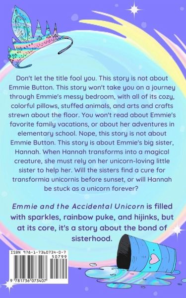 When Emmie Button's big sister, Hannah, transforms into a magical creature, Hannah must rely on her unicorn-loving little sister to help her. Will the sisters find a cure for transformia unicornis before sunset, or will Hannah be stuck as a unicorn forever? Emmie and the Accidental Unicorn is filled with sparkles, rainbow puke, and hijinks, but at its core, it's a story about the bond of sisterhood.