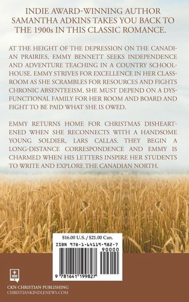 INDIE AWARD-WINNING AUTHOR SAMANTHA ADKINS TAKES YOU BACK TO THE 1900S IN THIS CLASSIC ROMANACE. At the height of the Depression on the Canadian prairies, Emmy Bennett seeks independence and adventure teaching in a country schoolhouse. Emmy strives for excellence in her classroom as she scrambles for resources and fights chronic absenteeism. She must depend on a dysfunctional family for her room and board and fight to be paid what she is owed. Emmy returns home for Christmas disheartened when she reconnects with a handsome young soldier, Lars Callas. They begin a long-distance correspondence and Emmy is charmed when his letters inspire her students to write and explore the Canadian North.