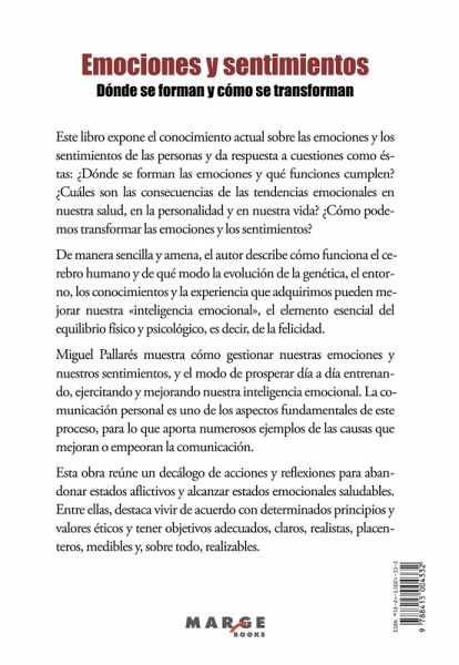 Este libro expone el conocimiento actual sobre las emociones y los sentimientos de las personas y da respuesta a cuestiones como éstas: ¿Dónde se forman las emociones?, ¿qué funciones cumplen las emociones?, ¿cuáles son las consecuencias de las tendencias emocionales en nuestra salud física y mental, en nuestra personalidad y en nuestra vida?, ¿cómo podemos transformar las emociones y los sentimientos? De manera sencilla y amena, el autor describe cómo funciona el cerebro humano y de qué modo la evolución conjunta de la genética, el entorno, los conocimientos y la experiencia que adquirimos pueden mejorar la inteligencia emocional, el elemento esencial del equilibrio físico y psicológico, es decir, de la felicidad. Miguel Pallarés muestra cómo gestionar las emociones y los sentimientos, y el modo de prosperar día a día entrenando, ejercitando y mejorando la inteligencia emocional. La comunicación personal es uno de los aspectos fundamentales de este proceso, para lo que aporta numerosos ejemplos de las causas que mejoran o empeoran la comunicación. Esta obra reúne un decálogo de acciones y reflexiones para abandonar estados aflictivos y alcanzar estados emocionales saludables. Entre ellas, destaca vivir de acuerdo con determinados principios y valores éticos y tener objetivos adecuados, claros, realistas, placenteros, medibles y, sobre todo, realizables.