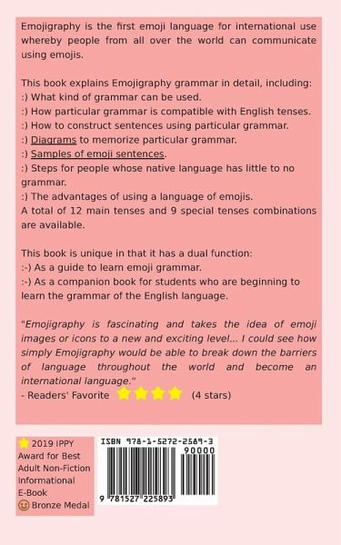 Bronze Medal winner of 2019 Independent Publisher Book Awards (IPPY Awards) for Best Adult Non-Fiction Informational E-Book. Emojigraphy is the first emoji language for international use whereby people from all over the world can communicate using emojis. As an international language, the grammar used in Emojigraphy is compatible with all English tenses. This book explains Emojigraphy grammar in detail, including: What kind of grammar can be used. How particular grammar is compatible with English tenses. How to construct sentences using particular grammar. Diagrams to memorize particular grammar. Samples of emoji sentences. Steps for people whose native language has little to no grammar. The advantages of using a language of emojis. A total of 12 main tenses and 9 special tenses combinations are available. This book is unique in that it has a dual function: As a guide to learn emoji grammar. As a companion book for students who are beginning to learn the grammar of the English language. By learning Emojigraphy grammar, we can understand both emoji language and the English language at the same time. Emoji language is now real ! More and more people will be online in the coming years; it is predicted that more than four billion people will use a mobile phone every day and communicate using emojis. Would you like to communicate with more than FOUR BILLION people AT ONCE ?